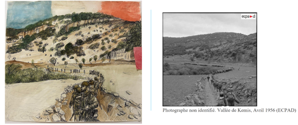 Ce premier dessin représente la participation des harkis pendant la guerre d’Algérie, il raconte l’engagement des algériens dans l’armée régulière française. Inspirée d’une photographie de l’ouvrage Photographier la guerre d’Algérie (2004), Mme Malgras a choisi de peindre un bataillon en mouvement marchant dans le Nord de l’Algérie. Le drapeau français, associé à l’Algérie française, reflète l’alliance et le soutien des Harkis à la France au cours de la guerre.